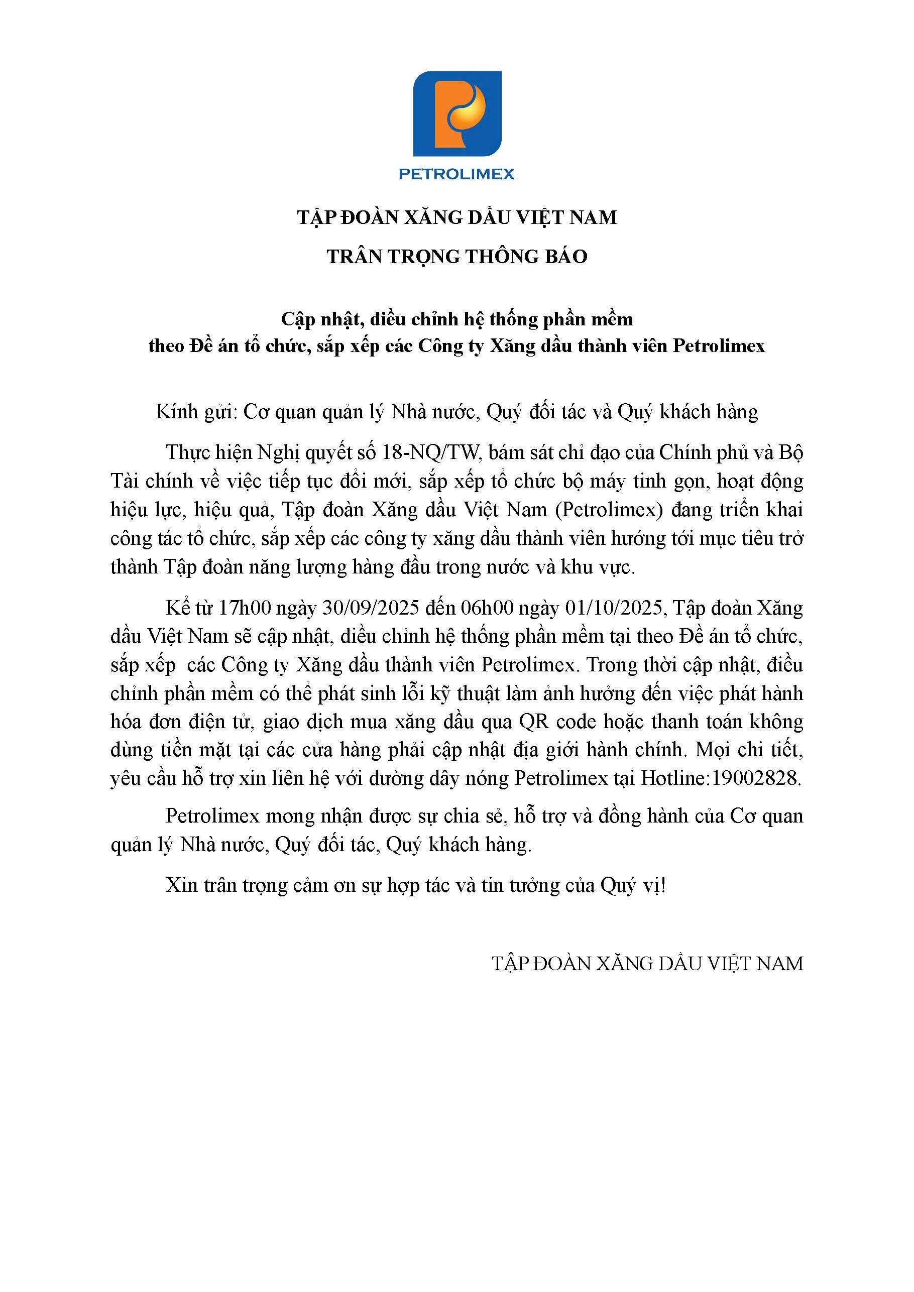 Kể từ 17h00 ngày 30/09/2025 đến 06h00 ngày 01/10/2025, Tập đoàn Xăng dầu Việt Nam sẽ cập nhật, điều chỉnh hệ thống phần mềm tại theo Đề án tổ chức, sắp xếp các Công ty Xăng dầu thành viên Petrolimex. Trong thời cập nhật, điều chỉnh phần mềm có thể phát sinh lỗi kỹ thuật làm ảnh hưởng đến việc phát hành hóa đơn điện tử, giao dịch mua xăng dầu qua QR code hoặc thanh toán không dùng tiền mặt tại các cửa hàng phải cập nhật địa giới hành chính.